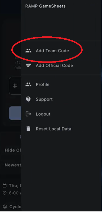Open the Game sheet App. You can add the team code by clicking the hamburger menu in the top right corner of the RAMP game sheet app and hitting “Add Team Code”.