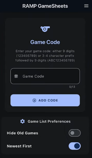 The coach or manager will provide you with the game code for the scorekeeper. These codes are either 9 or 13 digits long and can be entered in the game code field at the top of the page. To enter the game code, simply tap the game code field and type in the game code you've been provided. After entering your code, hit the add code button or check mark depending on your phone and you'll be taken to that game to start the entering process.