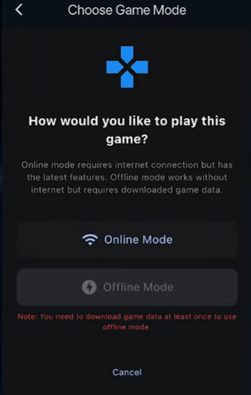 Before you can enter the game, you can choose to work in online mode or offline mode. The first time it opens, you'll be required to mark it as online mode so it can pull down game data for you to use. Once you have done this once, you'll be able to open this game in offline mode and use the data you've saved to your local device if you don't have internet inside of the facility you are working in. Entering online mode, the game data will be pulled down to your device and you'll have full access to the game.