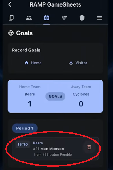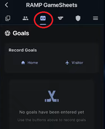 The goals page is where you'll be able to enter the scoring results for both teams. To do this, simply hit the home or visitor button on the goals page.