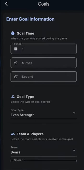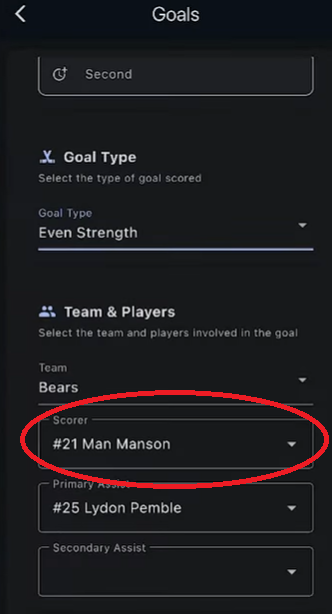 It'll give you the option to select the period, minute, and second of the goal that is on the score clock. We do not require the minute and second however the game sheet app will not allow these fields to be blank so do the best you can. Scrolling down, the option to select a goal type if it was not even strength and change it here. Then you can select who scored.