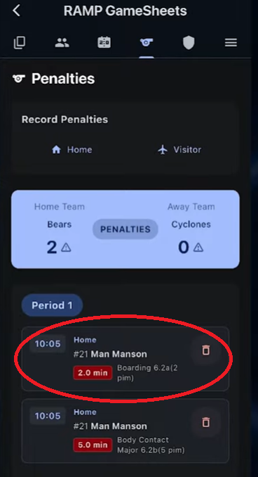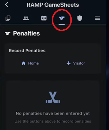 Underneath of the penalties tab at the top, you can add penalties the same way for the home and visitor team by tapping the button in question for each team.