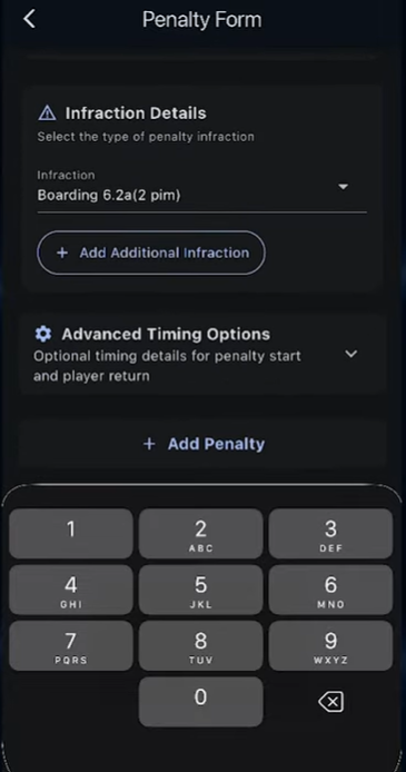 At this point you can enter again the time and second that is on the clock. Select a player to be penalized as well as an optional served field and select an offense. Once you have added an offense, you have the option to add additional offenses if multiple penalties were taken by the same player by hitting the add additional infractions button below it. You will then be able to select an offense for the additional infraction. Once you have filled out all of these fields, hit the “Add Penalty” and this will be saved.