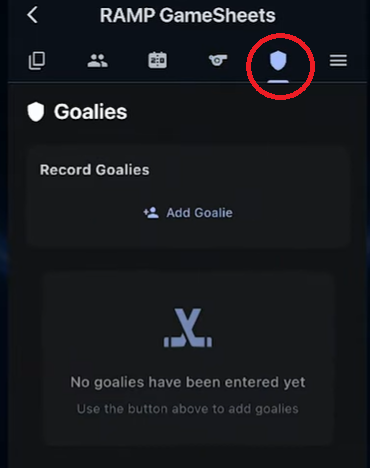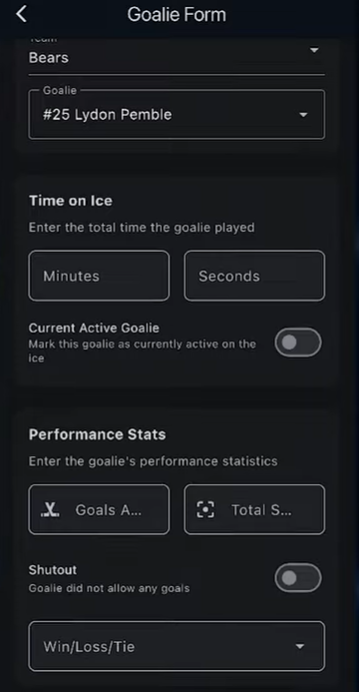 Simply hit the “Add Goalie” button, select a team, select which player was the goalie, and enter the time on ice, performance stats, win loss, tie, and hit the add goalie button. Similarly, goalie stats can be entered at the end of the game and edited as needed. We do not require goalie stats so completing these is optional for each team.